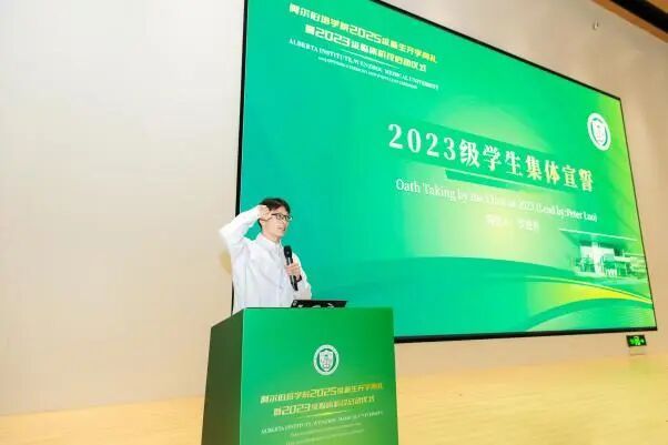 报告厅内瞬间沉静,领誓人罗恩哲手持誓词,以铿锵有力的声音带领全体2023级学子宣读英文版医学生誓言。每一句 “健康所系,性命相托” 的承诺,都似在叩击人心,凝聚着对医学事业的敬畏。随后,中加双方嘉宾依次上台,为即将步入临床阶段的同学们细致整理白大褂,并为他们郑重扣上第一颗纽扣——这枚小小的纽扣,不仅系住了医学生的专业与身份,更象征着医学责任与使命的接力传承。授袍结束后,同学们在誓词上郑重签下自己的名字,标志着这场医学“成人礼”圆满完成。笔墨落下的瞬间,既是对今日誓言的践行,更是对未来坚守医者初心、守护生命健康的坚定承诺。