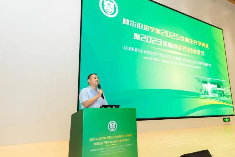 朱雪波副校长深情回顾了学院五年来的辉煌成就:从摘得国际医学教育协会ASPIRE奖,到首批毕业生荣获国家奖学金并赴顶尖医学院深造、保研“双一流”高校,再到新校区建设稳步推进,每一步都凝聚着学院师生的心血与努力。她向新生寄语“三望”:一是希望同学们“融汇中西”,抓住全英文授课和海外交流的宝贵机遇,炼就国际视野;二是希望同学们“锐意创新”,以“早科研、早临床”为阶梯,学习优秀校友陈禹辛发表6篇SCI论文、赴加直博的勇气,勇闯科研新境;三是希望同学们“修身厚德”,传承胡佳盛数千小时志愿服务、刘志轩“共富菜园”的仁爱精神,做有温度的健康守护者。