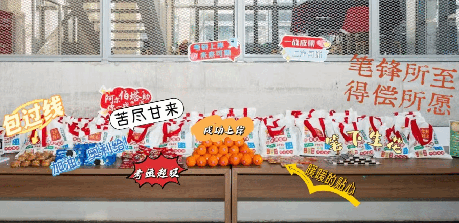 这份充满心意的加油物资里,藏着诸多美好寓意:印有“橙功上岸”的新鲜橙子,寄托着顺利上岸的祝愿;寓意“包过线”的小面包,寓意着稳稳过线、不负努力;“苦尽甘来”的咖啡,陪伴学子们熬过备考的艰辛岁月;“考运超旺”的旺仔牛奶糖,愿大家考试时好运加持;刻着“加油!奥里给”的奥利奥,是俏皮又有力的鼓劲;还有“暖暖的贴心”暖宝宝,”笔下生花“的考试用笔,为冬日备考的学子带来阵阵暖意。每一份物资都承载着学院的深情关怀,愿考研学子带着这份温暖与好运,在考场上披荆斩棘、一战成硕,不负韶华与热爱。