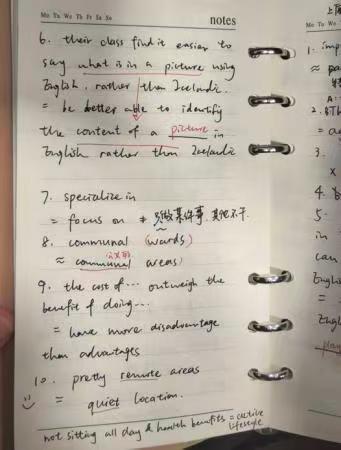 口语和听力是相辅相成的。我会把听力错题复盘时遇到的陌生词汇或者地道表达记在小本子上,试着用在口语中。对于雅思口语的备考,我觉得最重要的是用自己的亲身经历串题。比如我当时就真的在考场上和考官吐槽早上七点就赶去练车考驾照、早起太痛苦,这种真实的小故事反而更容易记住,也更有交流感。此外我强烈推荐B站up主薛麦,她的表达非常地道。我在准备好串题之后,会用她视频里的地道表达替换我原本的表述。遇到不太熟悉的话题,比如“二手网站”,她的回答给了我很大的启发。一个小提醒:考试时如果没听清题目,一定要礼貌追问。我当时在没有听清题目的情况下,硬着头皮回答,结果考官听了我的答案后摇摇头又重复了一遍问题,白白浪费了时间。