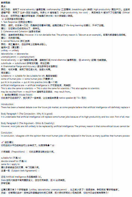 其次,同义替换是词汇分的核心。在小作文中,描述“上升”“下降”等趋势的短语多变,是得分关键;在大作文中,应避免“I think”等表达通篇出现,多积累如“reckon”“suspect”等同义词汇。Jackie老师会对我们写过的每一篇文章进行精批和精讲,找出写作中每一个细小的错误,并修改润色每一句不够地道的表达。